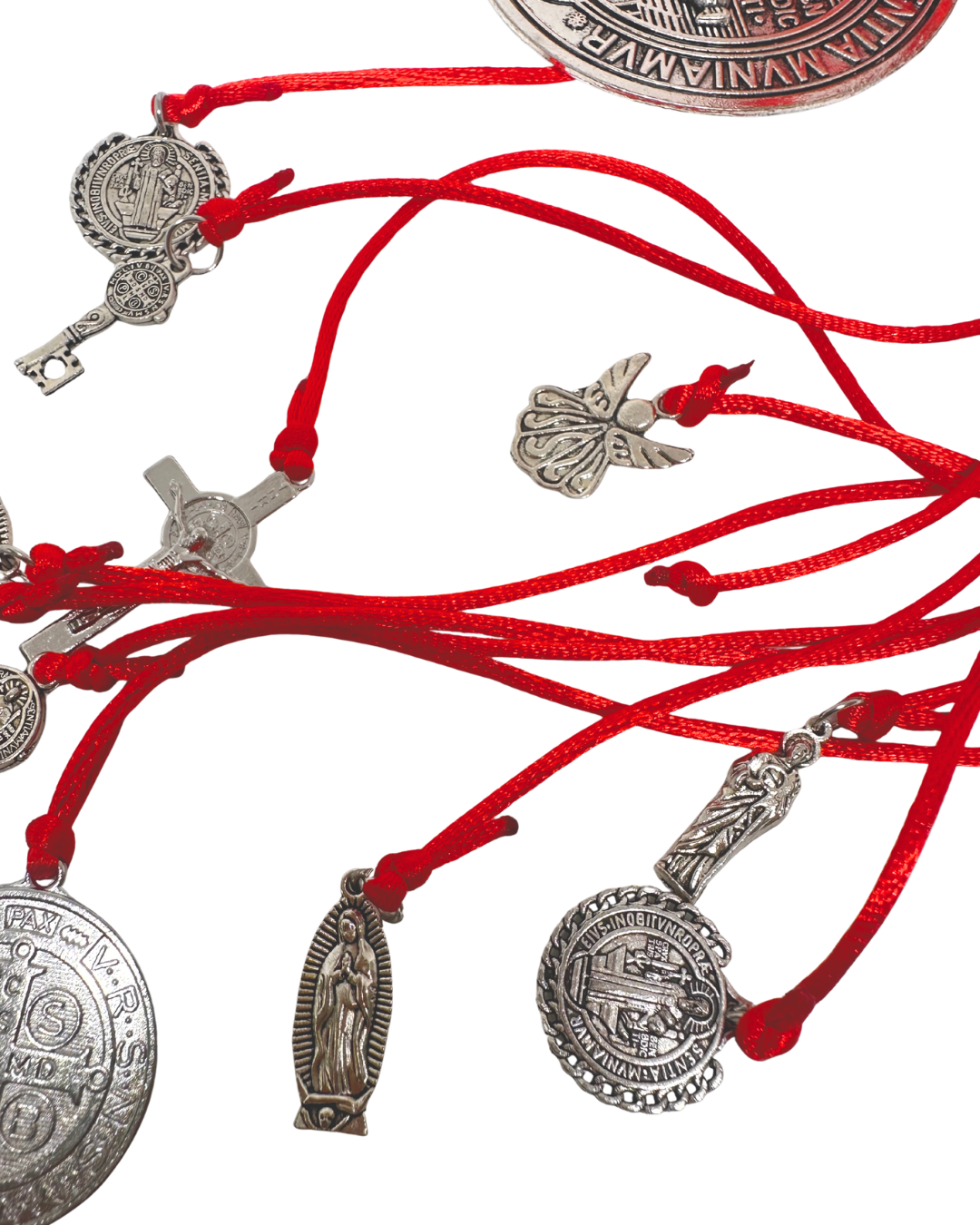 Este hermoso Detente de San Benito es un símbolo tradicional de protección y bendición para colocar en la puerta de tu casa, oficina o espacio personal. Elaborado con una medalla metálica de excelente calidad y acompañado por listones y cordones rojos, combina devoción y belleza en una sola pieza.